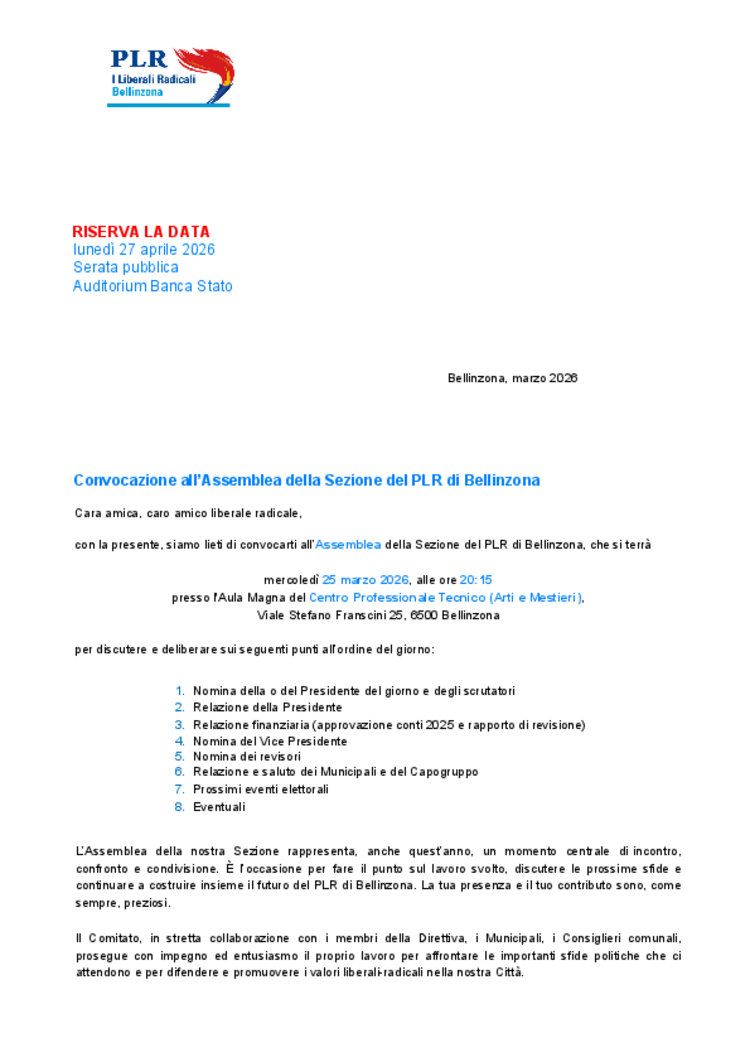 l’Assemblea generale PLR Bellinzona si terrà martedì 25 marzo 2026 alle ore 20.15, presso la Scuola Arti e Mestieri Bellinzona.
